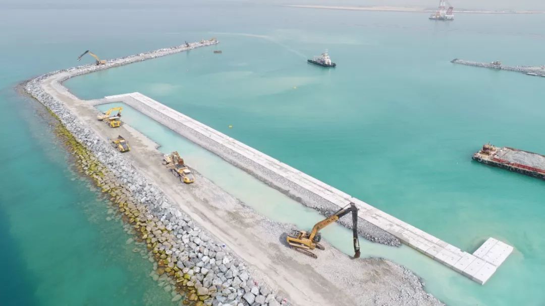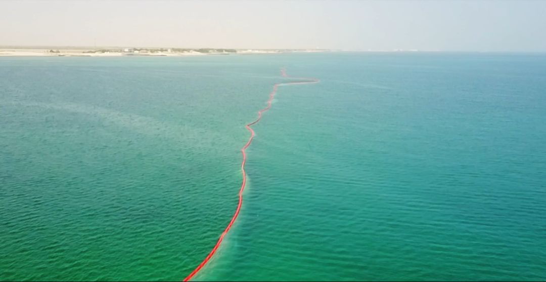 在水工结构开工之前围设防淤帘,其主要作用是形成一道防污屏障,用来阻隔和限制施工区域内搅动的泥沙及产生的污染物向施工区域以外扩散,从而确保施工区域周围的水体不受污染;同时,防御帘还起到了阻拦海龟、海豚等海洋动物误入施工区域的作用。从环保的角度来讲,这些伸展在海面上醒目的橙红色“防污染警戒线”,传达了中国企业绿色环保理念的生态保护线。
