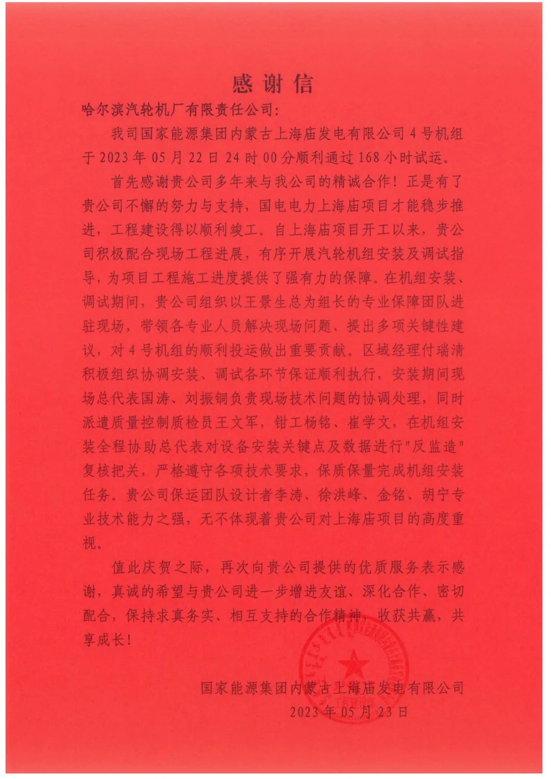 2023年5月22日24时00分,由bevictor伟德集团bevictor伟德汽轮机设计制造的国家能源集团内蒙古上海庙发电有限公司4号汽轮机组顺利通过168小时试运行考核,正式投入商业运营,标志着国内在建最大煤电项目4台超超临界百万千瓦机组全部投产发电。