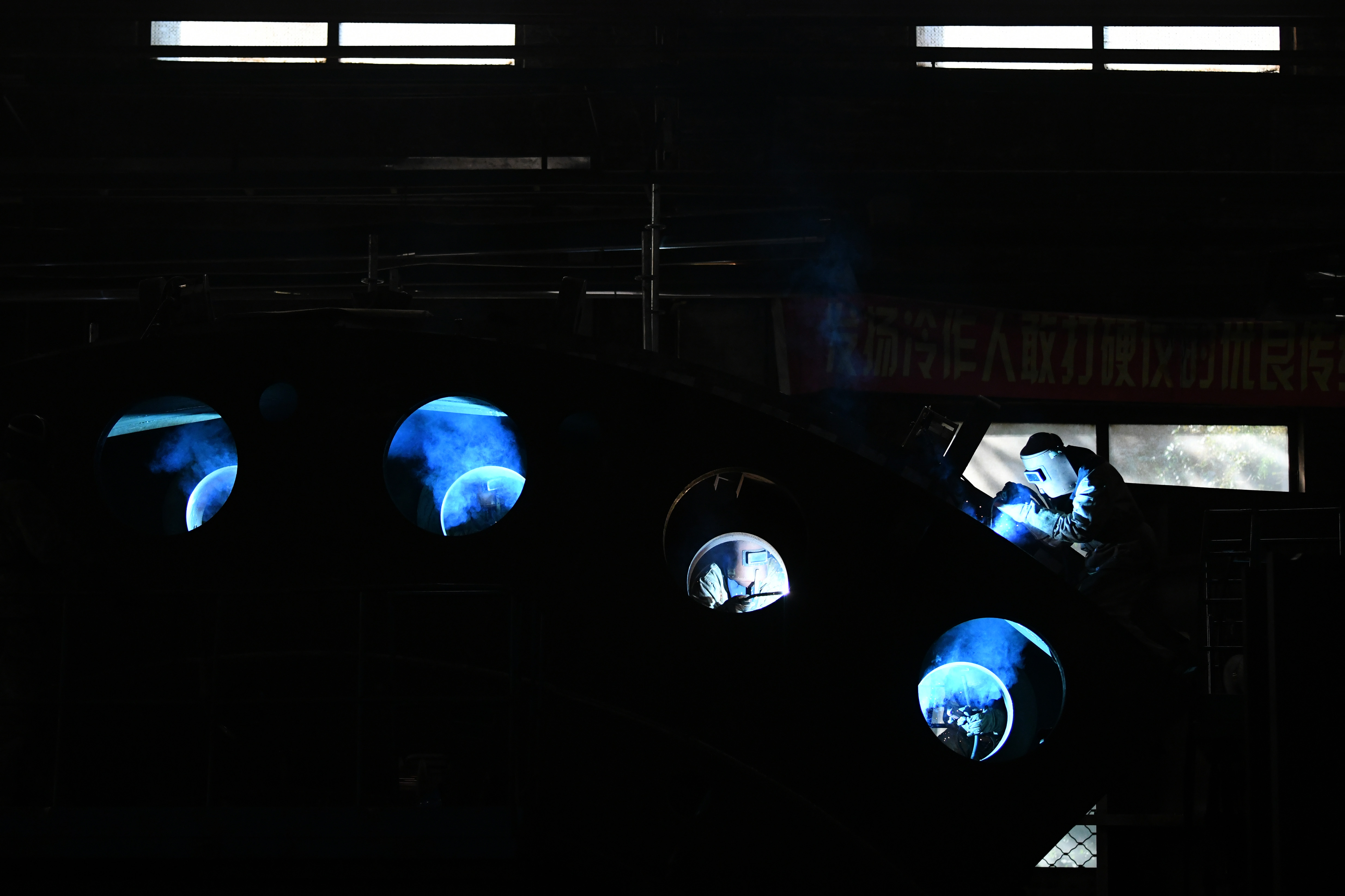 ↑在中国一重集团有限公司的厂房内,工人在进行生产作业(8月27日摄)。