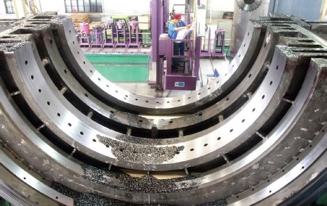 一台台“精品”的成功出产,刻录着9米立车的赫赫功勋。2007年,企业开始推行6S管理,厂区面貌发生了翻天覆地的变化,9米立车也披上了“新外衣”,显得更加神清气爽。在生产高峰期,9米立车平均一年能加工上百个工件,最小的是十几公斤一块的压板,排成一圈24块;最大的要数黄登转子支架中心体,重量几乎达到了9米立车承重极限:产品质量件件一流,9米立车操作者所在的班组也被誉为“公司安全质量优秀班组”。